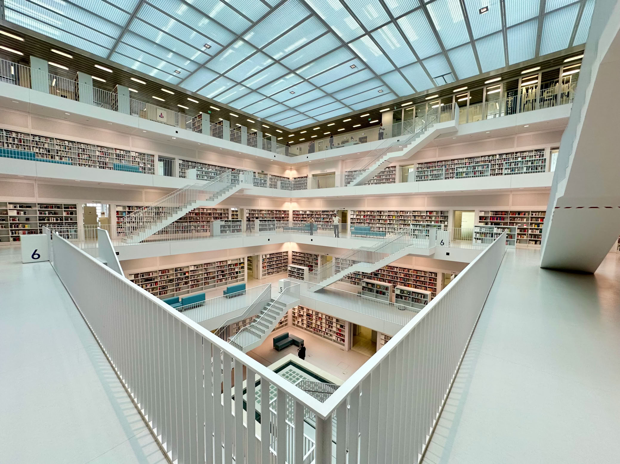 Sie ist nicht nur Bibliothek, sondern auch einer der berühmtesten Insta Spots Stuttgarts. Das zentrale Atrium mit seinen symmetrischen Ebenen wirkt wie ein begehbares Koordinatensystem aus Licht und Papier.